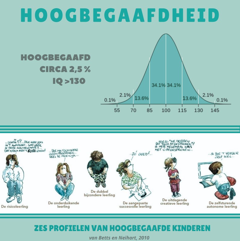 Deze infographic illustreert de kenmerken van hoogbegaafdheid. HB is een combinatie van uitzonderlijke intelligentie, creativiteit en doorzettingsvermogen. Een hoogbegaafd kind is een snelle en slimme denker, die complexe zaken aan kan, sensitief en emotioneel is en intens levend.